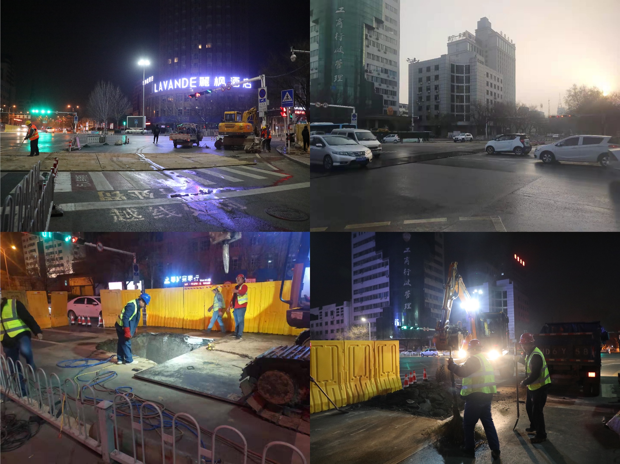 由于施工路段為城市主干道,且施工部位位于交叉路口,人員密集、車流量較大,地下線路分布復雜與城區(qū)地下管網圖紙多處不符,施工中存在諸多難點。公司迅速組建項目專項指揮小組,制定施工方案,實施錯峰作業(yè),集中在夜間施工。在以往道路施工安全管理要求的基礎上,加派專人進行夜晚施工期間的交通引導,白天鋪設鋼板,確保交通通暢,并安排專職安全員對施工區(qū)域內鋪設的鋼板進行定時巡視。施工期間,與沿途各交叉管線的產權單位溝通協(xié)調多點地勘,從人工開挖探溝確保沿途各管線線路的安全,到夜間現(xiàn)場管理人員的組織調度,各項工作有序銜接,穩(wěn)步推進。