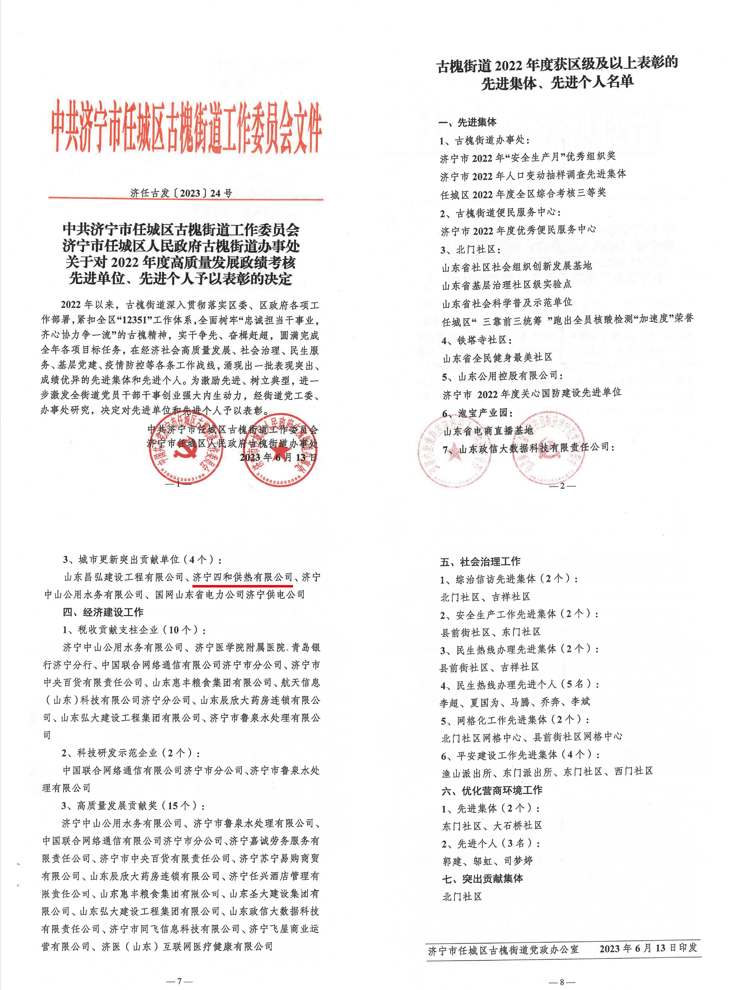 濟寧四和供熱有限公司榮獲古槐街道 2022年度“城市建設(shè)突出貢獻單位”表彰
